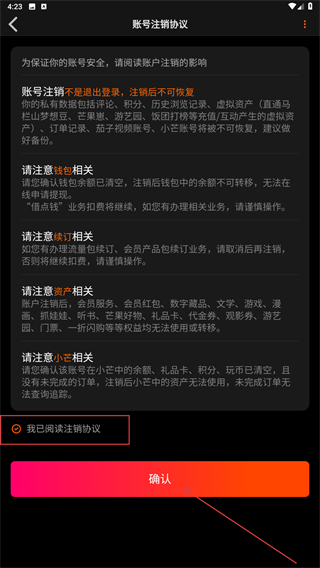 5、仔細閱讀賬號注銷協(xié)議,勾選我已閱讀后點擊確認按鈕即可。
