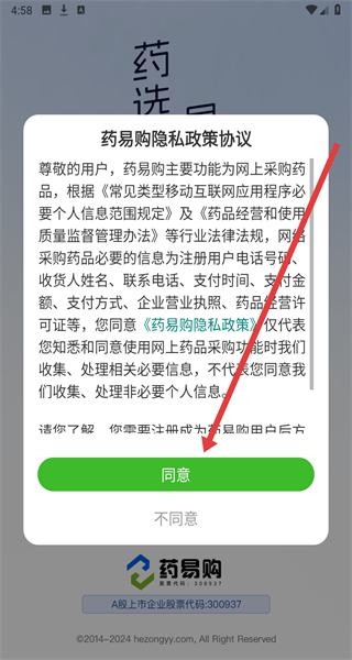 1、在打開藥易購app時,可以通過點擊彈窗中的同意按鈕,進入使用。