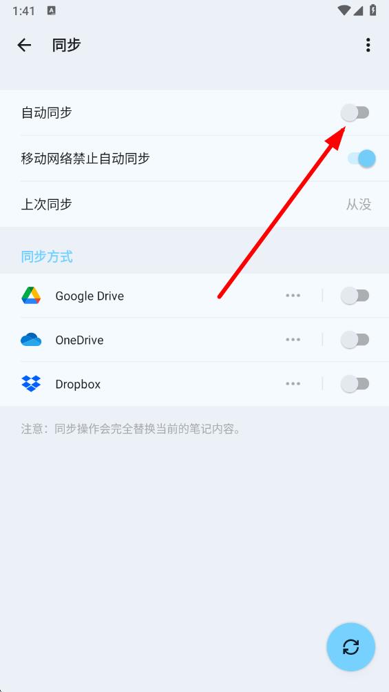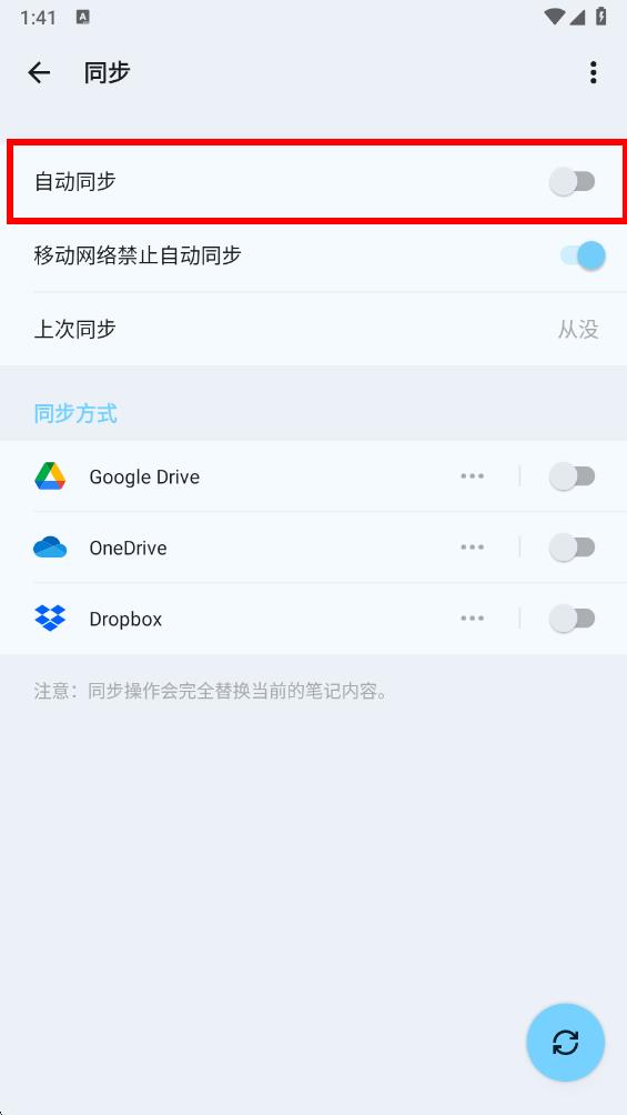 4、點擊自動同步選項右側(cè)的開關(guān)按鈕,將其開啟,即可成功啟用自動同步功能。