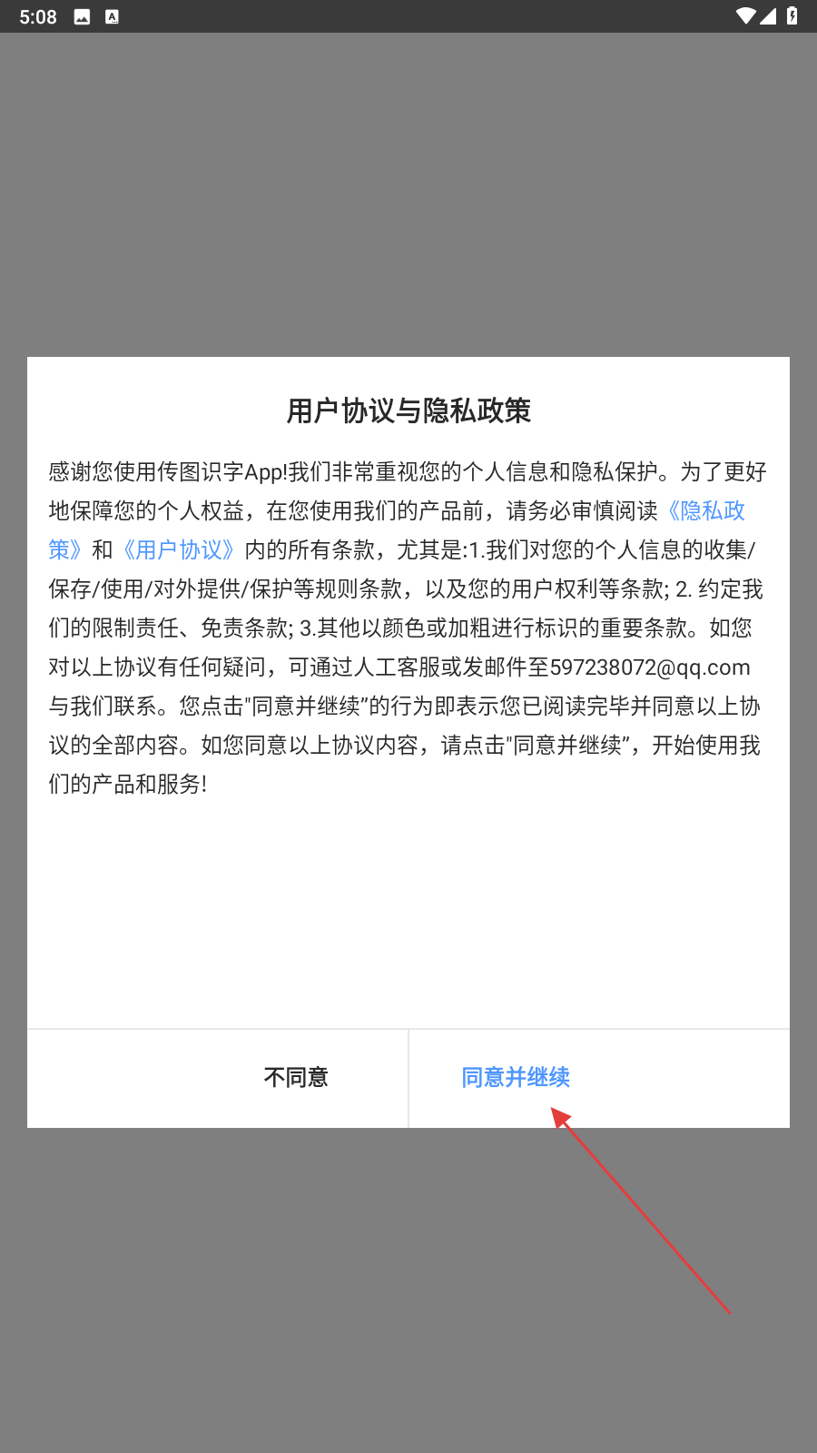 1、啟動傳圖識字的應(yīng)用軟件,進(jìn)入時會跳出用戶協(xié)議與隱私政策,點(diǎn)擊同意并繼續(xù)的按鈕即可進(jìn)入。
