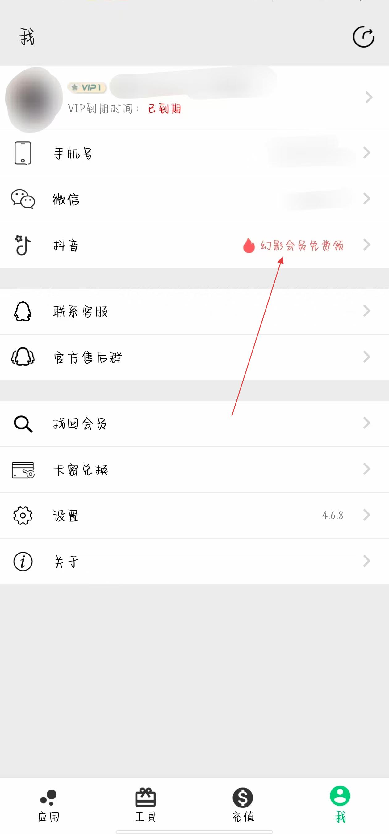 1、打開幻影分身應(yīng)用,點擊底部導(dǎo)航欄中的我,進入個人中心頁面,找到抖音選項,點擊右側(cè)幻影會員免費領(lǐng)。