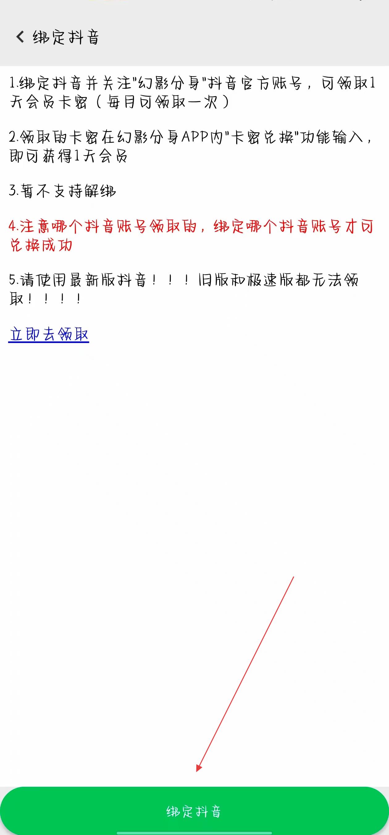 2、進入綁定抖音頁面后,查看相關(guān)領(lǐng)取規(guī)則說明,確認無誤后,點擊頁面下方綠色的綁定抖音按鈕。