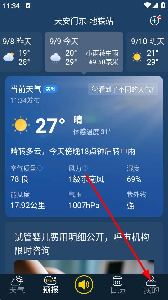 1、在天氣預(yù)報(bào)界面點(diǎn)擊底部導(dǎo)航欄最右側(cè)的我的選項(xiàng)。