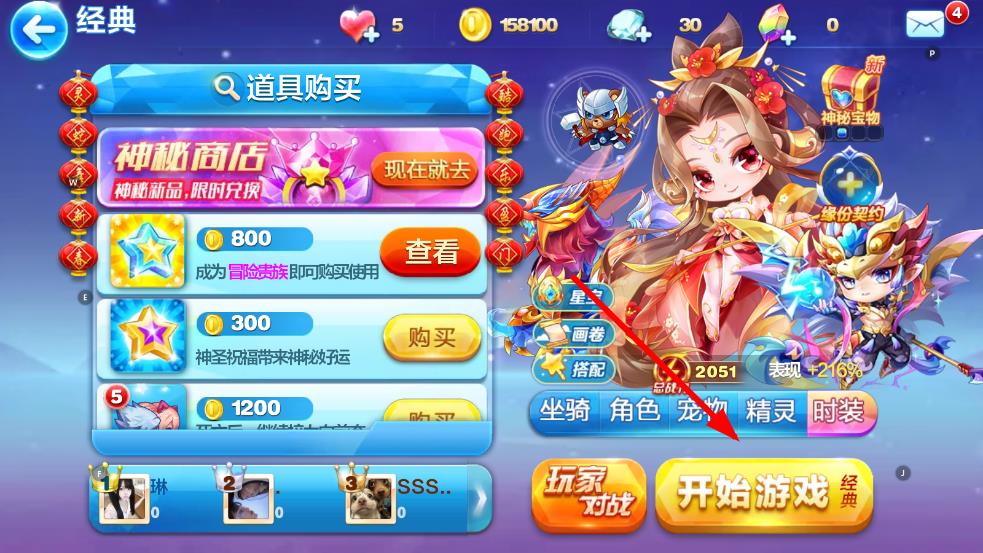 1、在道具購買界面,確認(rèn)好角色、坐騎、寵物、精靈等搭配后,點擊開始游戲按鈕,進(jìn)入游戲關(guān)卡。