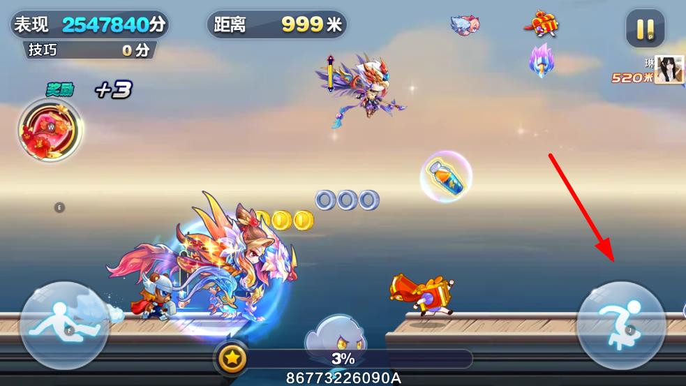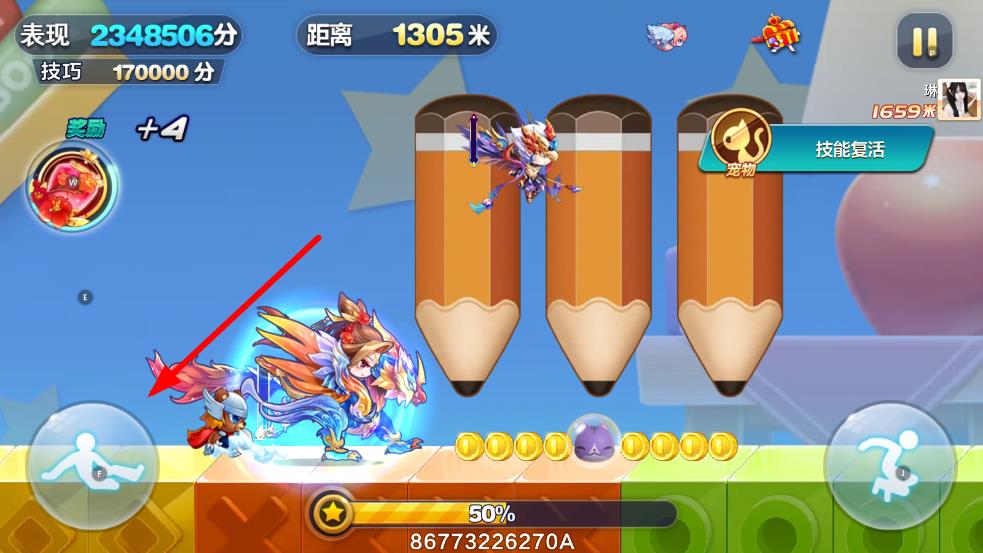3、當(dāng)遇到障礙物時,迅速點擊屏幕左側(cè)的下滑按鈕,讓角色下滑通過,避免碰撞,在角色擁有技能時,合理把握釋放時機(jī)。