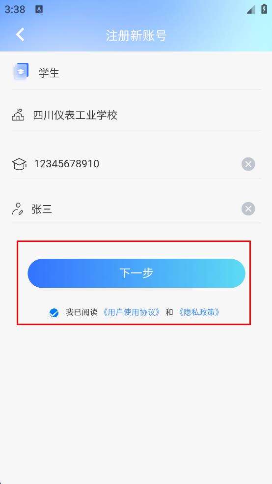 4、勾選我已閱讀用戶使用協(xié)議和隱私政策,點擊“下一步”繼續(xù)注冊流程。