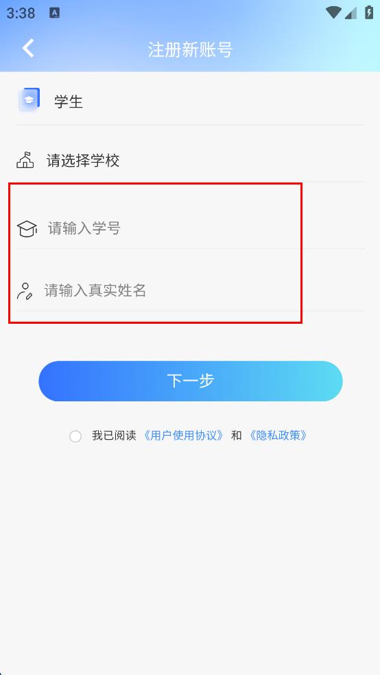 3、在注冊新賬號頁面,選擇學(xué)校,輸入學(xué)號,接著輸入真實姓名。