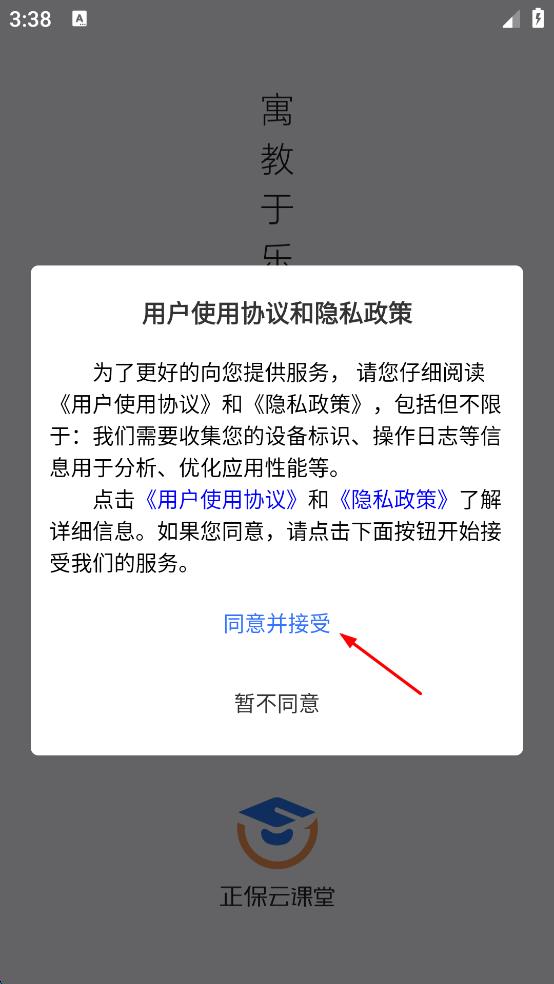 1、打開正保云課堂APP,出現(xiàn)用戶使用協(xié)議和隱私政策界面,仔細閱讀后點擊“同意并接受”,進入登錄頁面。