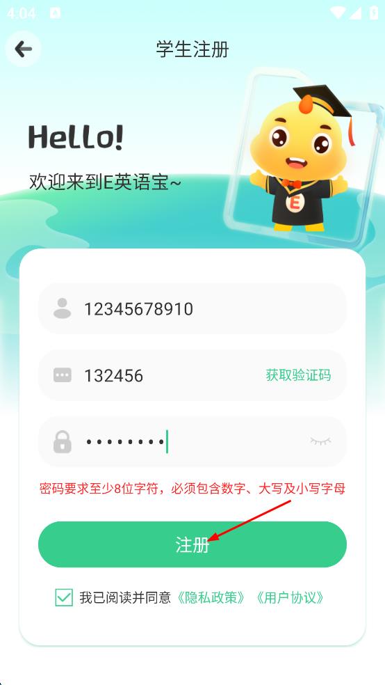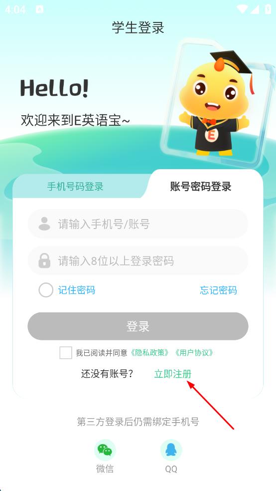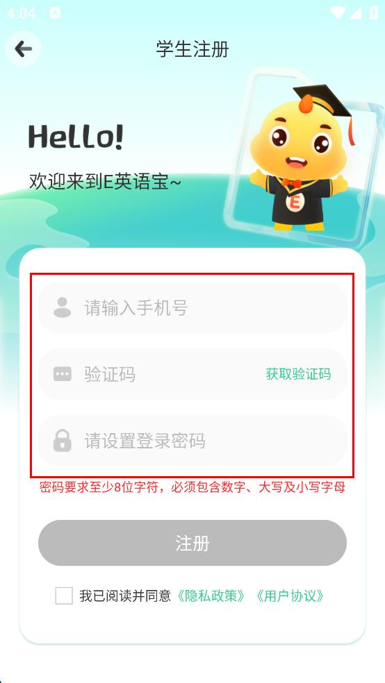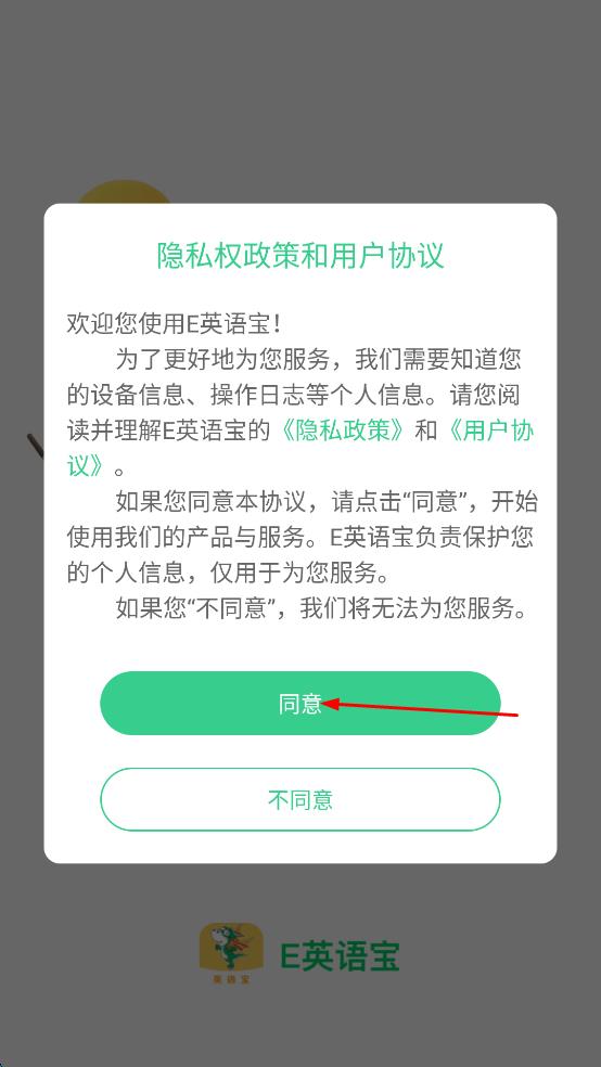 1、打開E英語寶,彈出隱私權(quán)政策和用戶協(xié)議提示,點(diǎn)擊同意,進(jìn)入學(xué)生登錄頁面。