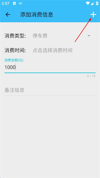 3、輸入消費金額,點擊右上角“+”號按鈕。