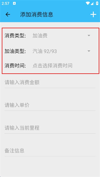 2、進入添加消費信息頁面,選擇消費類型為“停車費”,并選擇消費時間。