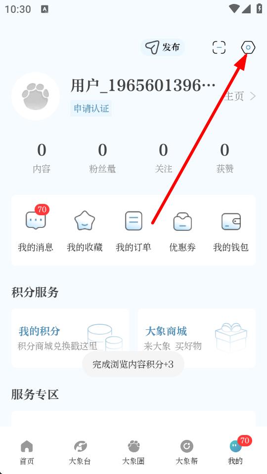 1、打開大象新聞App,點擊我的進入個人頁面,點擊右上角設(shè)置圖標。