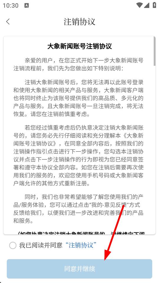 4、仔細閱讀大象新聞賬號注銷協(xié)議,勾選我已閱讀并同意注銷協(xié)議,再點擊同意并繼續(xù),按后續(xù)提示完成賬號注銷。