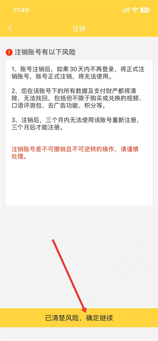4、點擊下方的按鈕,按照后續(xù)提示完成賬號注銷。