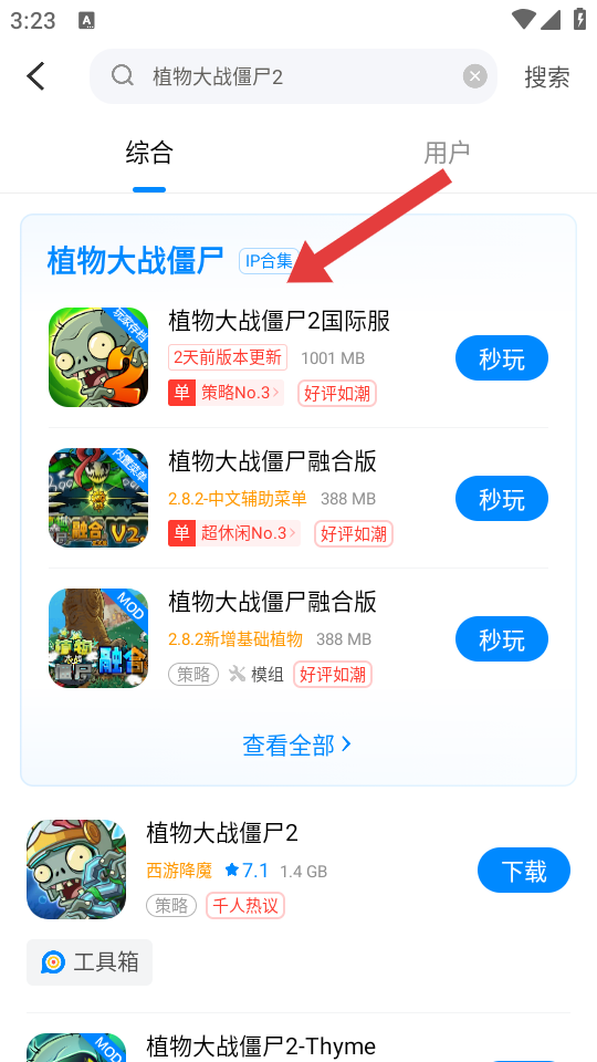 3、在搜索結(jié)果的綜合頁(yè)面,找到目標(biāo)游戲,點(diǎn)擊進(jìn)入應(yīng)用詳情頁(yè)面。