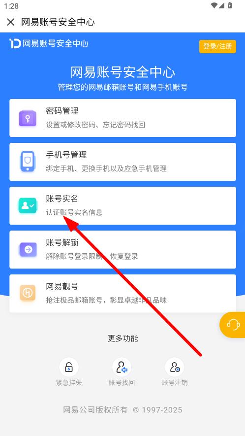 5、在網易賬號安全中心頁面,點擊賬號實名,按頁面提示完成實名認證操作。