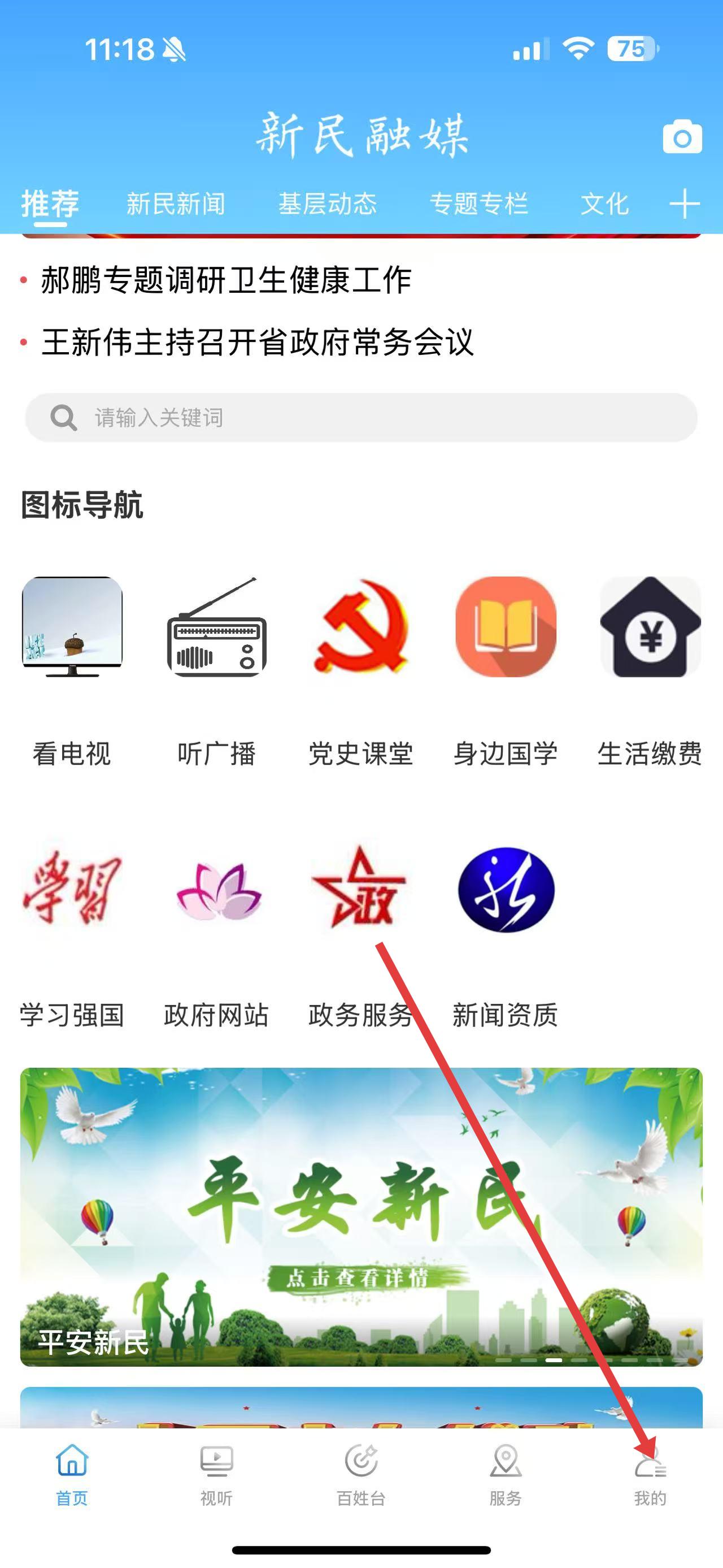 1、打開新民融媒app,在首頁點(diǎn)擊底部導(dǎo)航欄最右側(cè)的我的選項(xiàng)。