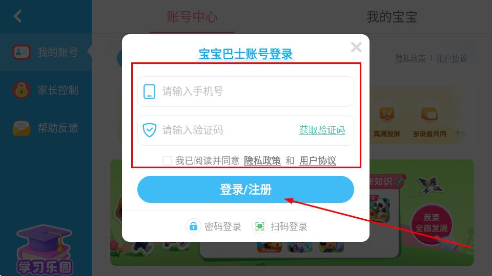 4、輸入手機號、驗證碼,勾選同意隱私政策和用戶協(xié)議,點擊登錄/注冊。