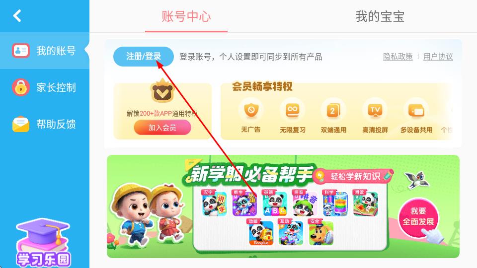 2、進入賬號中心頁面后,點擊注冊/登錄按鈕。