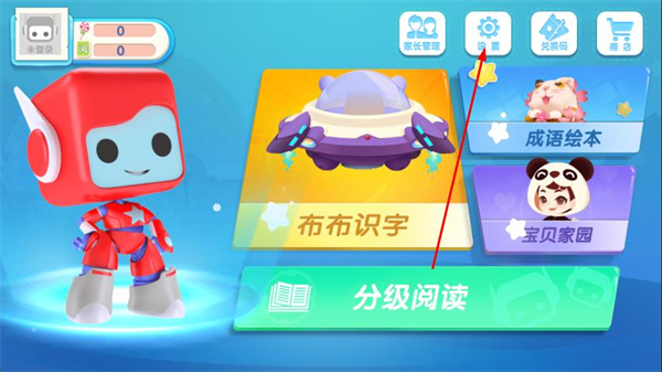 1、打開(kāi)布布識(shí)字app,點(diǎn)擊主界面右上方的設(shè)置圖標(biāo)。