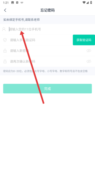 3、在進(jìn)入到忘記密碼頁(yè)面中,需先點(diǎn)擊上方輸入框填寫手機(jī)號(hào),以便獲取驗(yàn)證碼進(jìn)行驗(yàn)證。