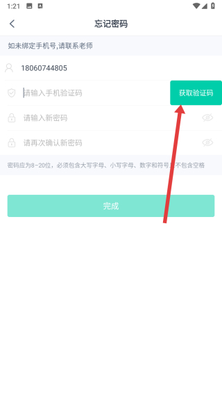 4、填寫好手機(jī)號(hào)時(shí)點(diǎn)擊獲取驗(yàn)證碼,等待填寫驗(yàn)證碼后,即可重新設(shè)置新密碼。
