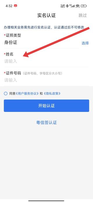 3、進(jìn)入實(shí)名認(rèn)證頁(yè)面,在姓名輸入框中填寫本人真實(shí)姓名,后續(xù)還需完善證件號(hào)碼等信息。