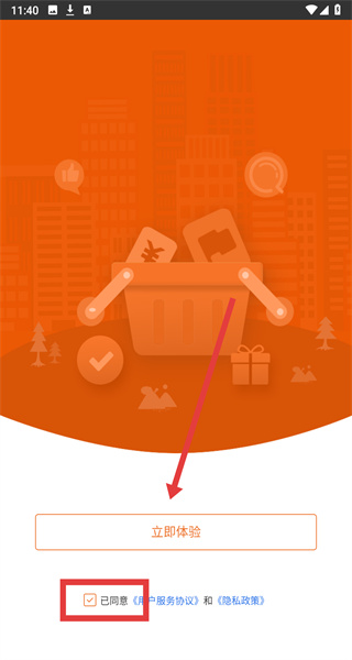 1、在打開app勾選已同意按鈕后,通過(guò)點(diǎn)擊立即體驗(yàn)按鈕,即可進(jìn)入app使用。