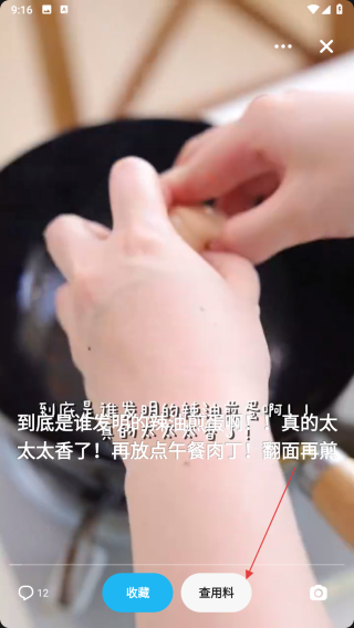 2、在視頻播放頁面點(diǎn)擊查用料,進(jìn)入菜譜詳情頁面。