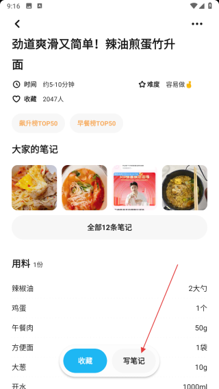 3、進(jìn)入菜譜詳情頁面后,找到并點(diǎn)擊寫筆記按鈕。