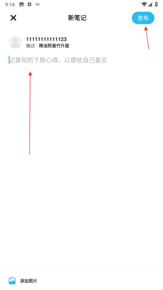 4、進(jìn)入新筆記編輯頁面,在輸入框內(nèi)填寫下廚心得等內(nèi)容,編輯完成后,點(diǎn)擊頁面右上角的發(fā)布按鈕。