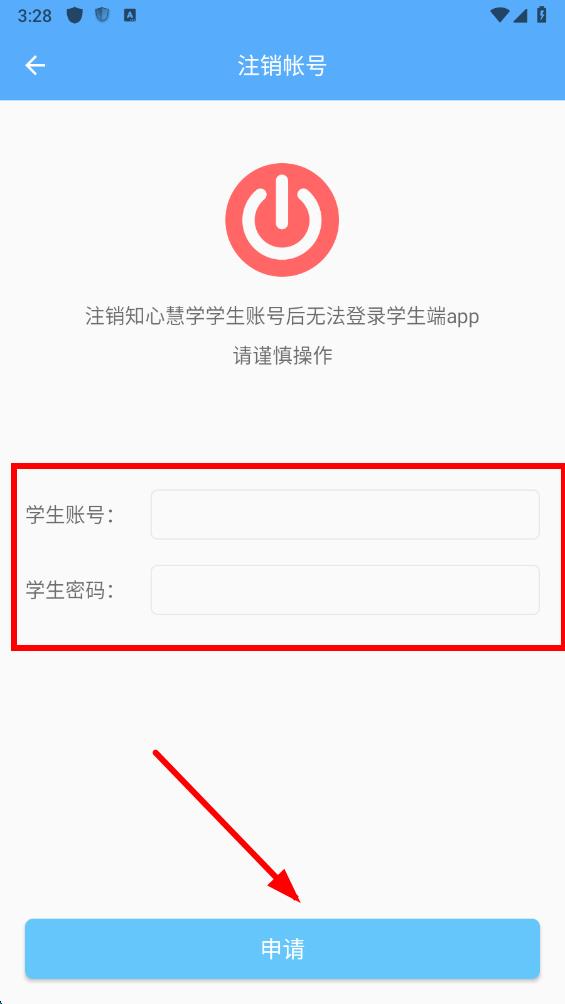 4、在賬號(hào)注銷界面,輸入學(xué)生賬號(hào)和學(xué)生密碼,然后點(diǎn)擊申請(qǐng)按鈕,即可申請(qǐng)注銷賬號(hào)。