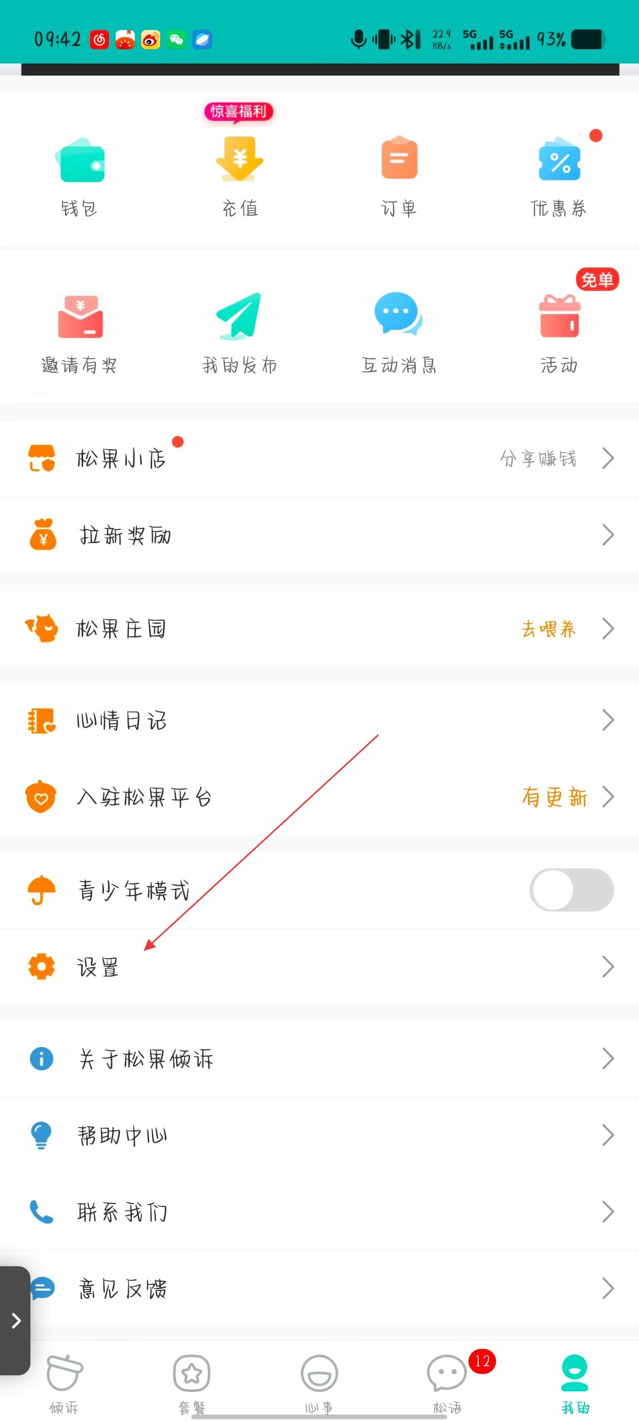 1、打開松果傾訴APP,進(jìn)入我的頁面,點(diǎn)擊設(shè)置選項(xiàng),進(jìn)入設(shè)置界面。