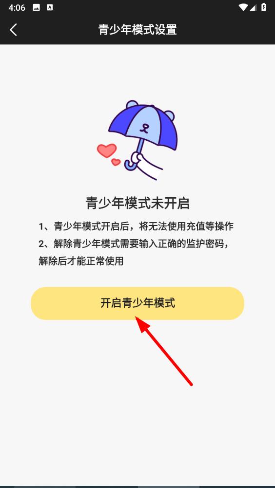4、在青少年模式設(shè)置界面中,點(diǎn)擊開(kāi)啟青少年模式按鈕,按照提示設(shè)置監(jiān)護(hù)密碼,即可成功開(kāi)啟青少年模式。