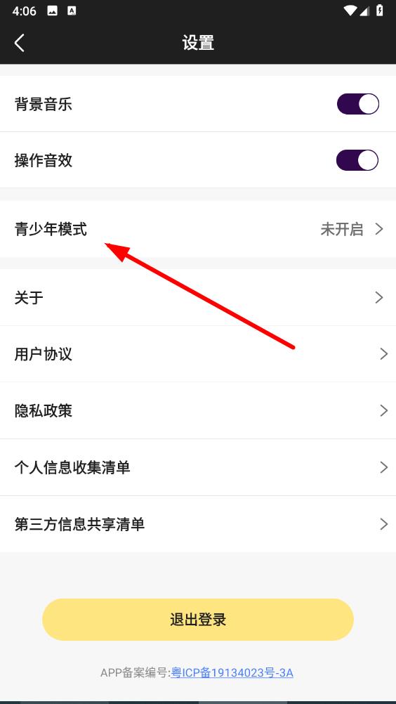 3、在設(shè)置頁(yè)面里,找到青少年模式選項(xiàng),點(diǎn)擊進(jìn)入青少年模式設(shè)置界面。