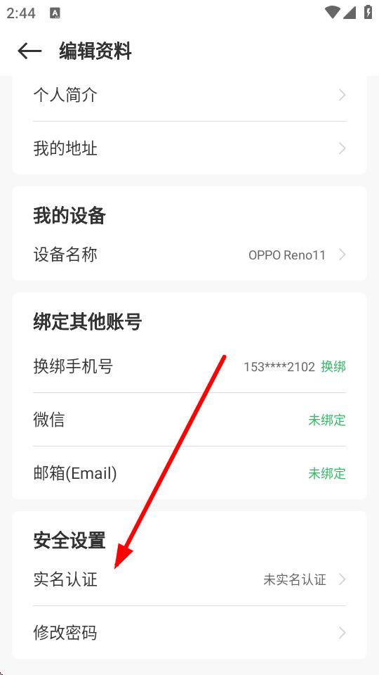 3、進(jìn)入編輯資料頁面后,下滑找到安全設(shè)置板塊里的實(shí)名認(rèn)證選項(xiàng)并點(diǎn)擊。