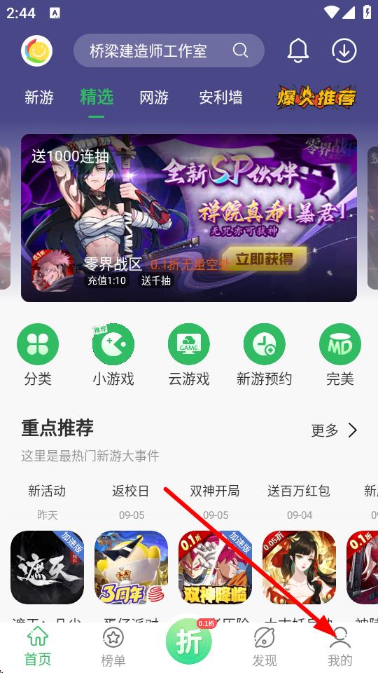 1、打開百分網(wǎng)游戲APP,點(diǎn)擊底部導(dǎo)航欄最右側(cè)我的選項(xiàng)。