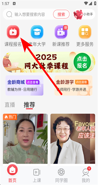 1、在網(wǎng)上老年大學(xué)的首頁(yè),點(diǎn)擊課程報(bào)名,進(jìn)入選課報(bào)名頁(yè)面。