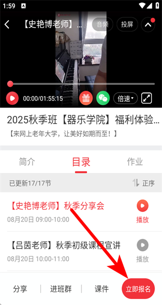 4、在課程詳情的頁(yè)面,點(diǎn)擊立即報(bào)名,完成課程報(bào)名的操作。