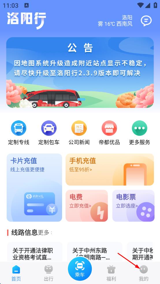 1、打開(kāi)洛陽(yáng)行軟件,進(jìn)入首頁(yè)后,點(diǎn)擊頁(yè)面右下角的“我的”選項(xiàng)。