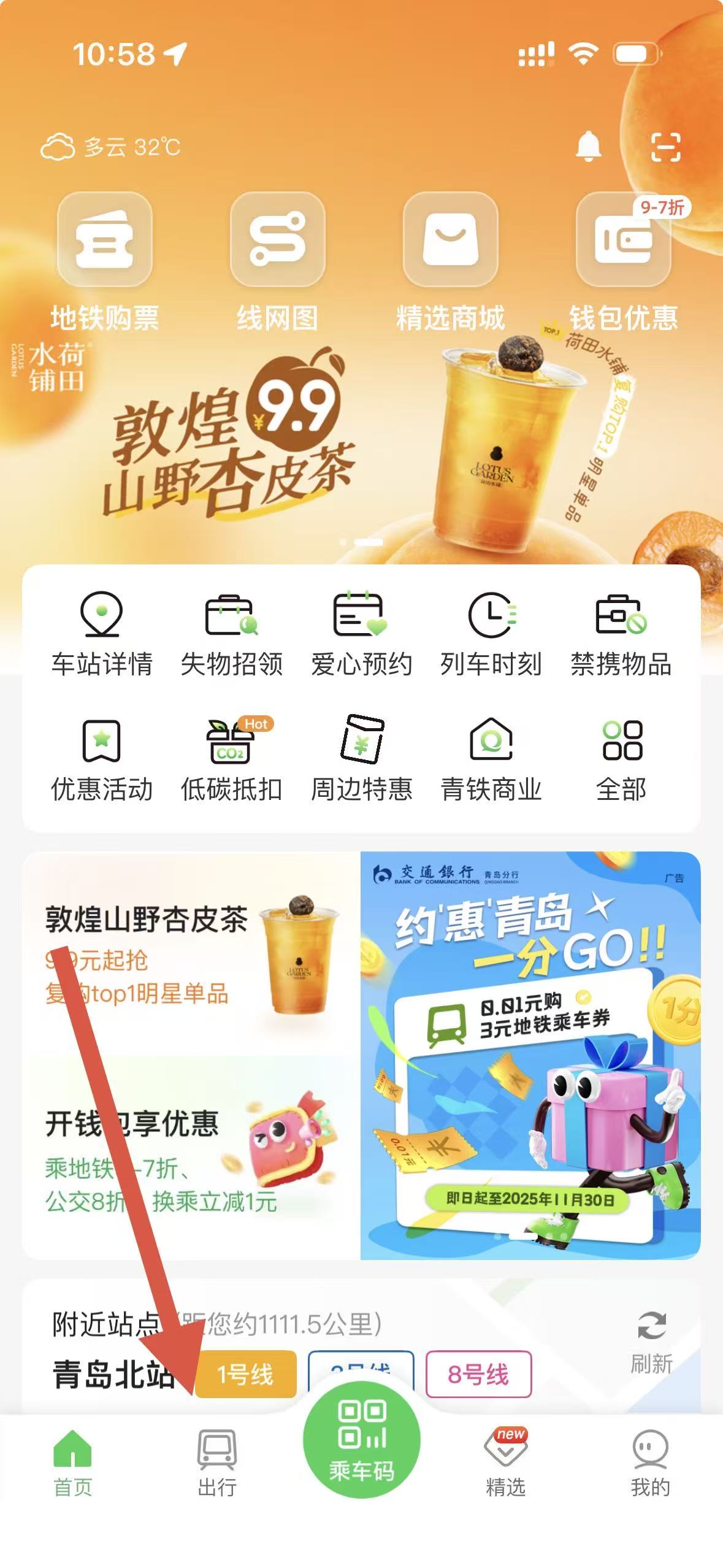 1、打開地鐵相關(guān)APP進(jìn)入首頁,點擊底部出行選項進(jìn)入出行頁面。