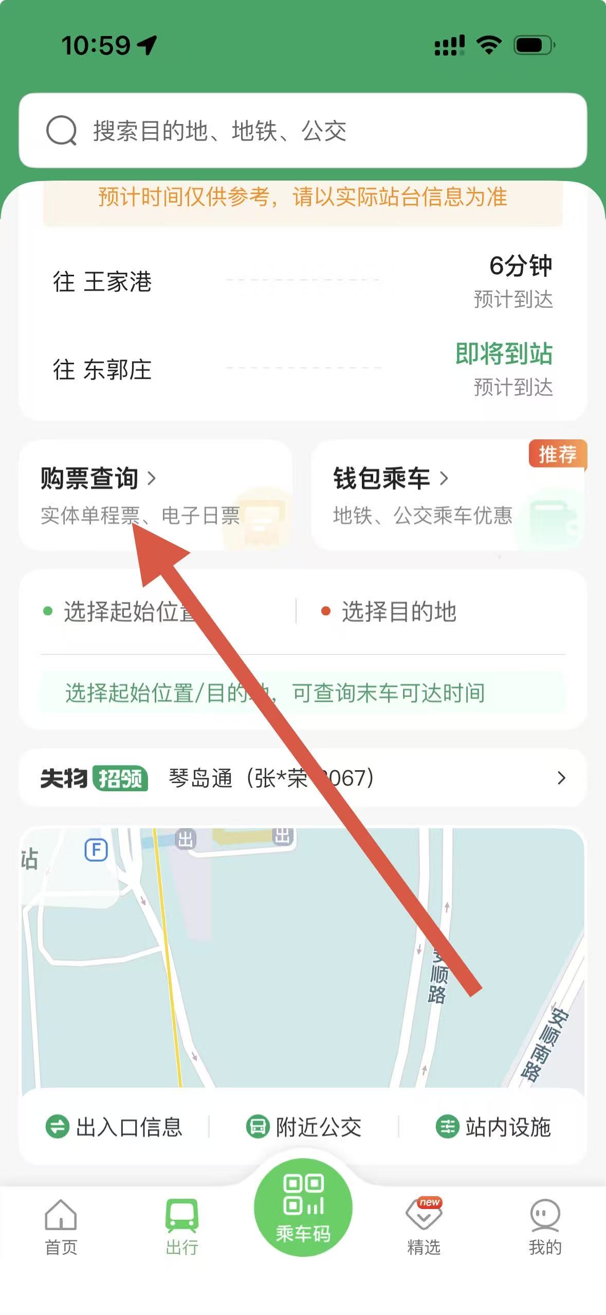 3、在出行頁面中,點擊購票查詢進(jìn)入地鐵購票界面。