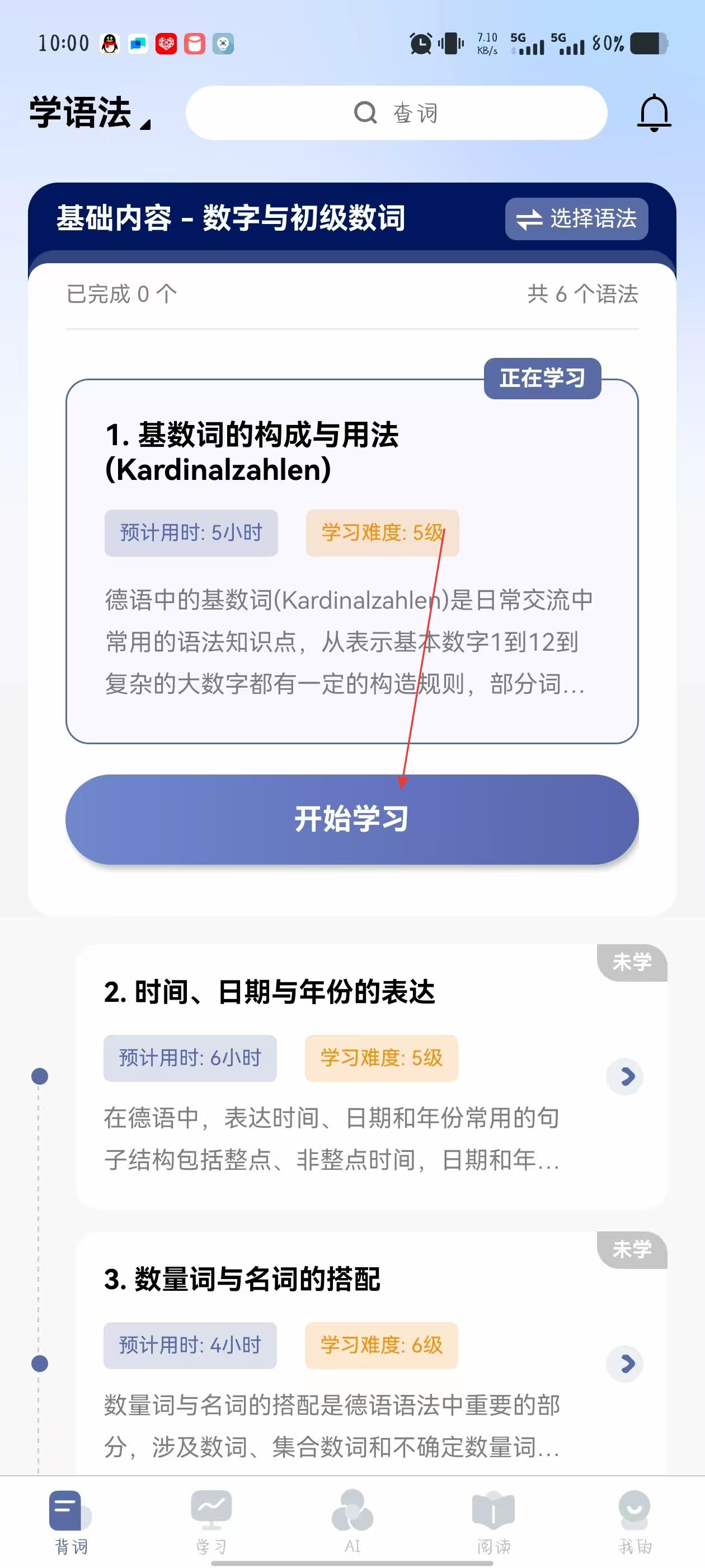 1、打開萊特德語(yǔ)背單詞APP,進(jìn)入學(xué)語(yǔ)法板塊,點(diǎn)擊卡片下方的開始學(xué)習(xí)按鈕。