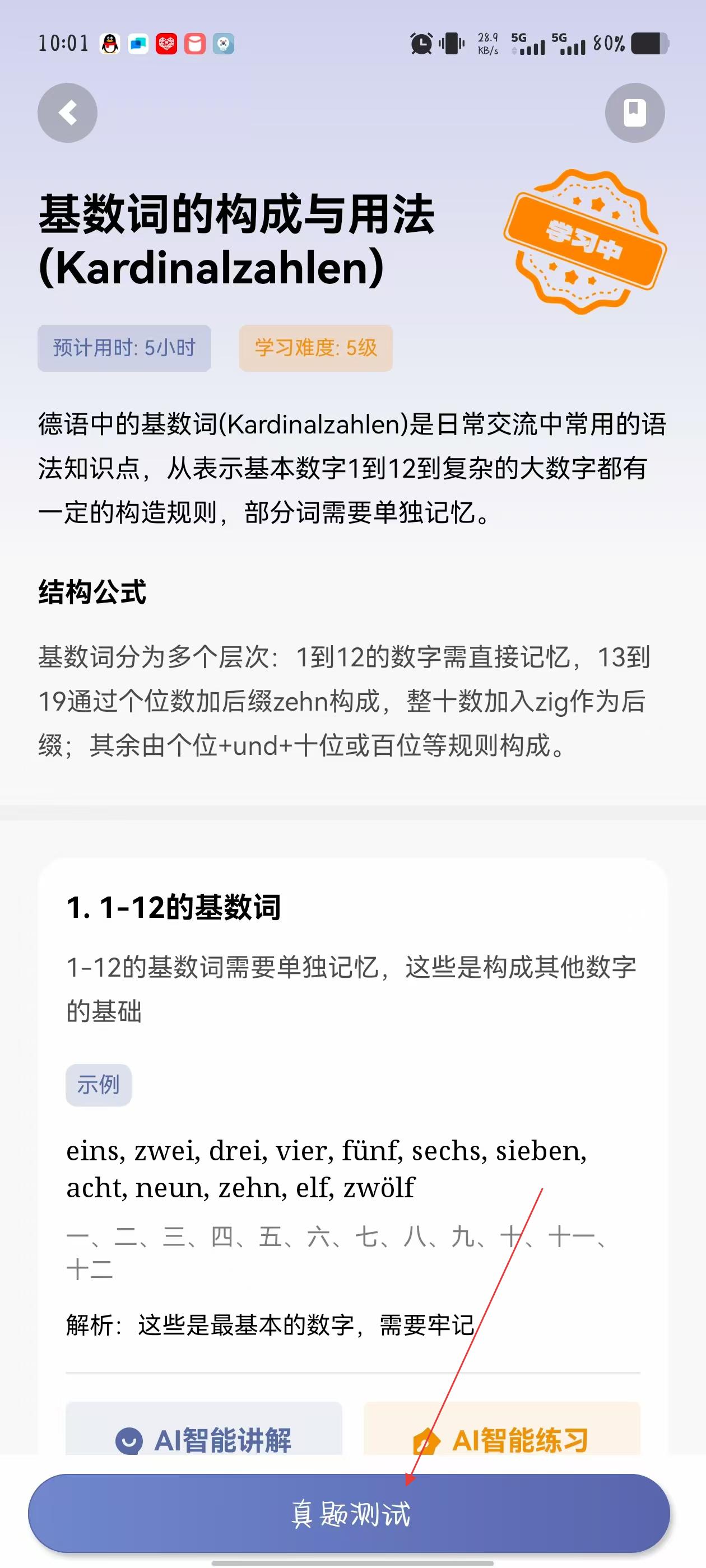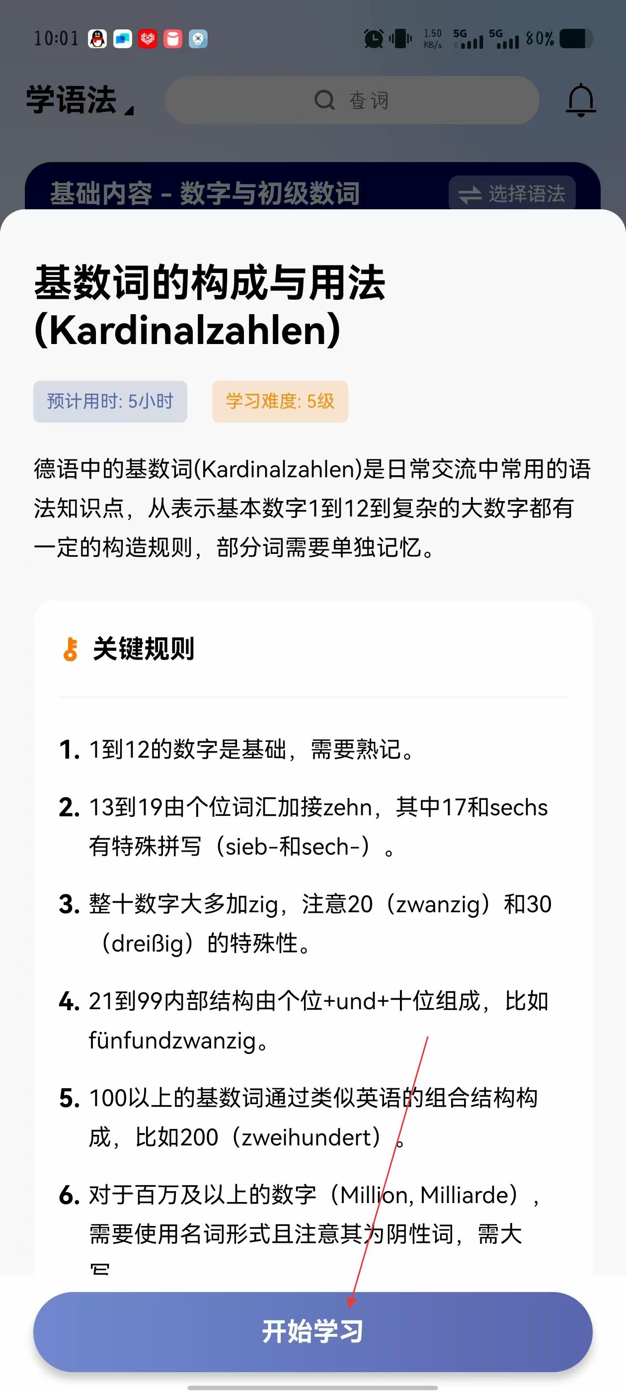 2、進(jìn)入基數(shù)詞的構(gòu)成與用法詳情頁(yè),查看關(guān)鍵規(guī)則等內(nèi)容后,點(diǎn)擊頁(yè)面底部的開始學(xué)習(xí)按鈕。