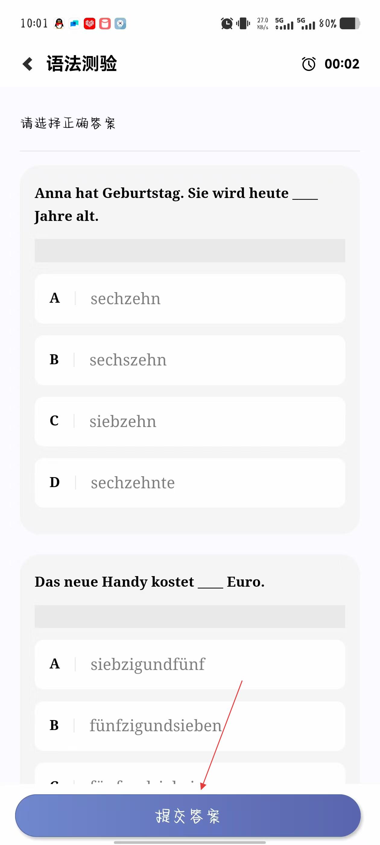 4、進(jìn)入語(yǔ)法測(cè)驗(yàn)頁(yè)面,完成題目選擇后,點(diǎn)擊提交答案按鈕即可。