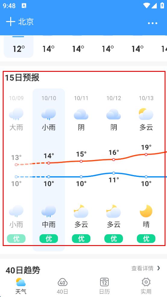 4、向上滑動頁面,還能查看該城市未來15日的天氣預報,了解后續(xù)天氣變化趨勢。
