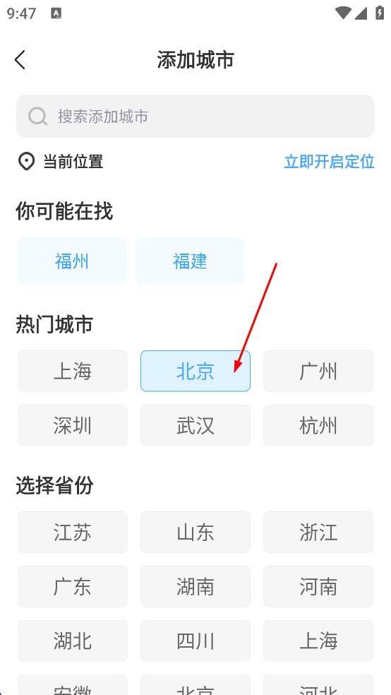 2、在APP主界面,進入添加城市頁面,選擇要查看天氣的城市,比如點擊“北京”。