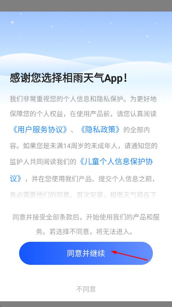 1、打開相雨天氣APP,在彈出的協(xié)議頁面,點擊“同意并繼續(xù)”按鈕,進入APP主界面。