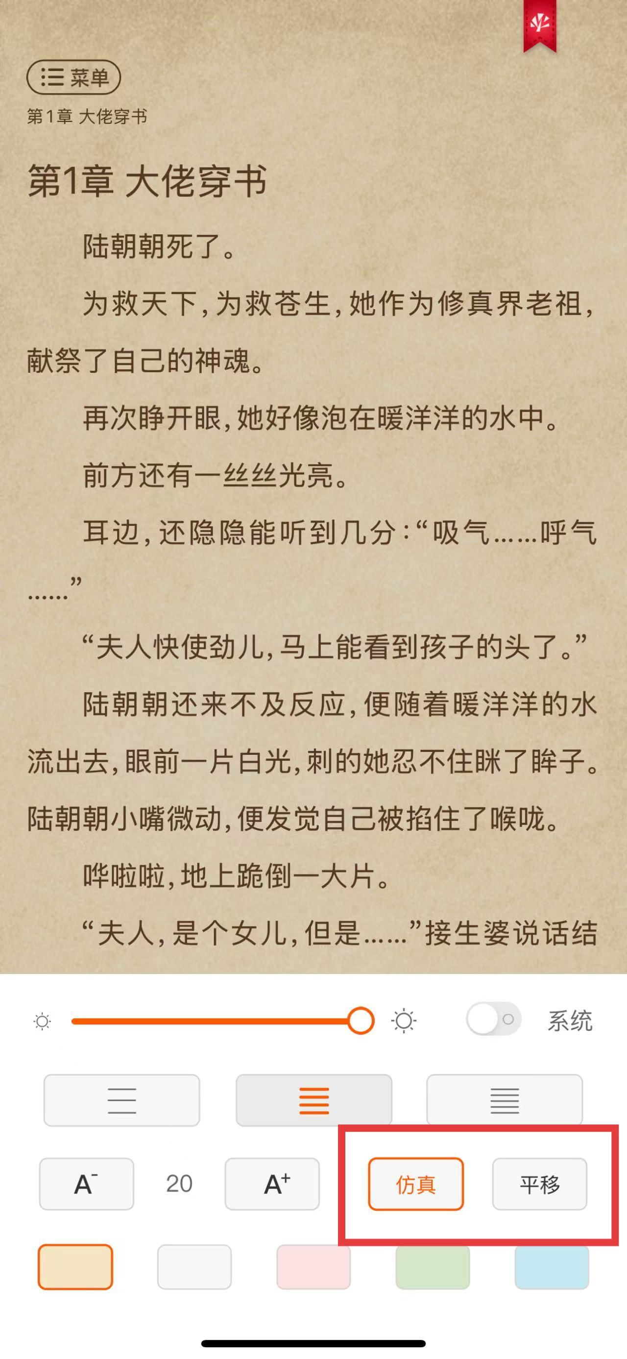 4、根據個人喜好,點擊選擇仿真或平移等翻頁方式,即可完成翻頁方式的更改。