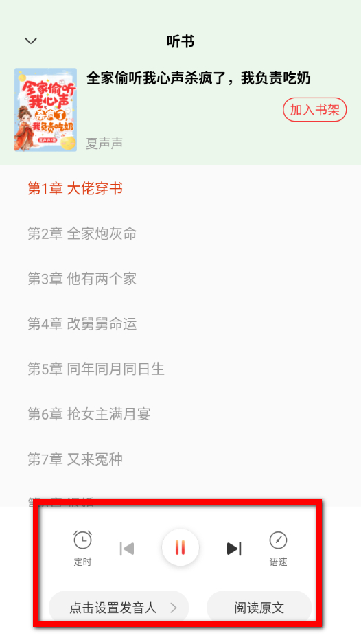 3、在聽書界面,選擇章節(jié)后,點擊播放按鈕,即可開始聽書。